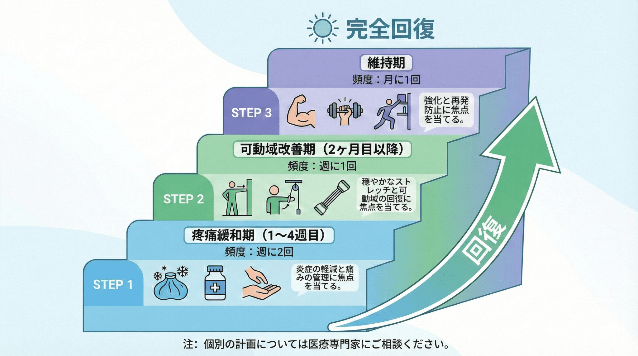 「いつか治るだろう」と痛みを我慢して放置するのは危険です。 初期の激しい痛みの時期(急性期)を過ぎると、次は「拘縮(こうしゅく)期」と呼ばれる、肩が凍りついたように動かなくなる時期がやってきます。 適切な治療やリハビリを行わないと、関節が固まったまま可動域が狭くなり、一生「腕が真上まで上がらない」「後ろに手が回らない」といった不自由な状態が残ってしまう可能性があります。 早期に適切な処置を行うことで、回復までの期間を大幅に短縮し、元のスムーズな動きを取り戻すことができます。