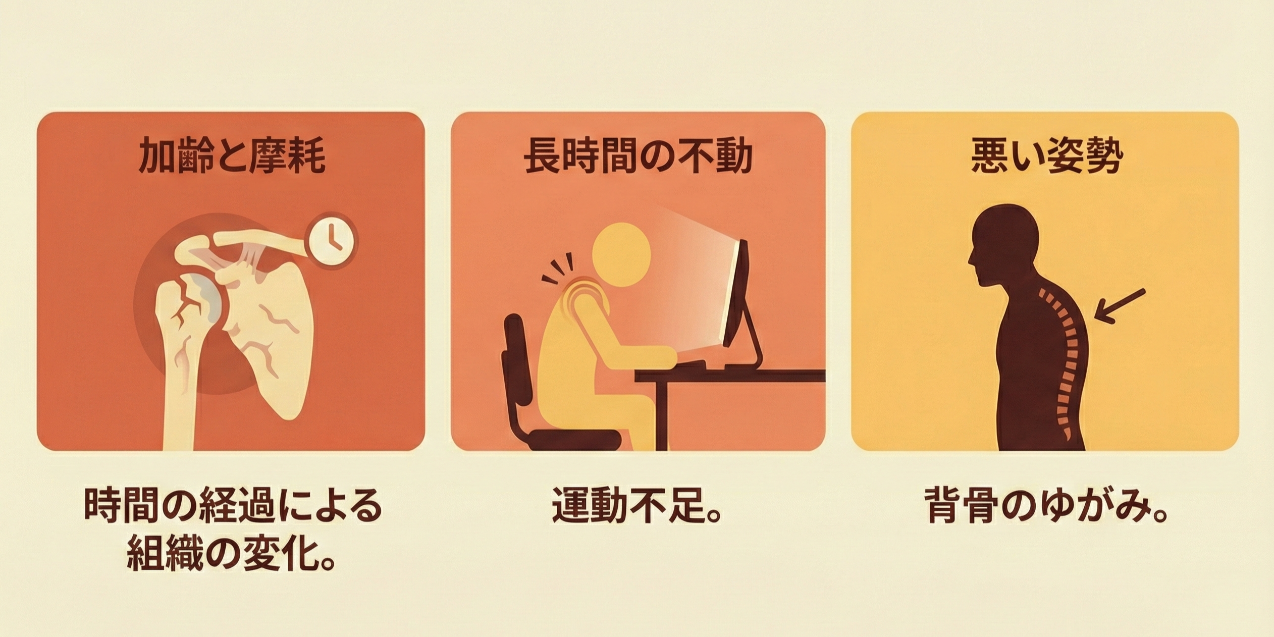 なぜ起こるの?主な原因 はっきりとした原因は現代医学でも完全には解明されていませんが、以下の要因が重なることで発症しやすくなります。 加齢による組織の変性 年齢とともに肩の関節を構成する組織が脆くなり、柔軟性が低下することで炎症が起きやすくなります。 血行不良と運動不足 普段から肩をあまり動かさない生活をしていると、肩周辺の血流が悪くなり、組織が硬くなってしまいます。 姿勢の悪さ(猫背・巻き肩) 背中が丸まり、肩が内側に入っていると、肩甲骨の動きが悪くなります。その状態で腕を動かそうとすると、肩関節に過度な負担がかかり、炎症の引き金となります。