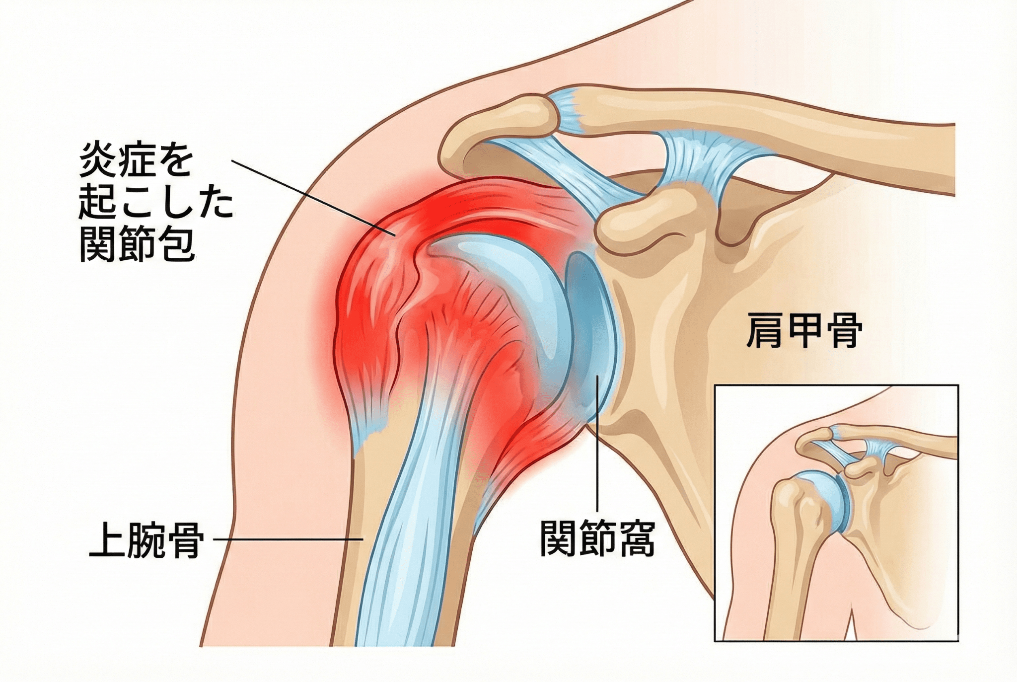 五十肩・四十肩とは? 医学的には「肩関節周囲炎(かたかんせつしゅういえん)」と呼ばれます。 肩は、骨と骨をつなぐ関節包(かんせつほう)や、複雑な筋肉・腱によって支えられています。五十肩・四十肩は、この「関節包」や「肩のインナーマッスル(腱板)」に炎症が起き、関節が固まって動きが悪くなっている状態です。 「肩こり」は主に筋肉の疲労によるものですが、「五十肩」は炎症ですので、無理に動かすと悪化するリスクがあり、適切な対処が必要です。